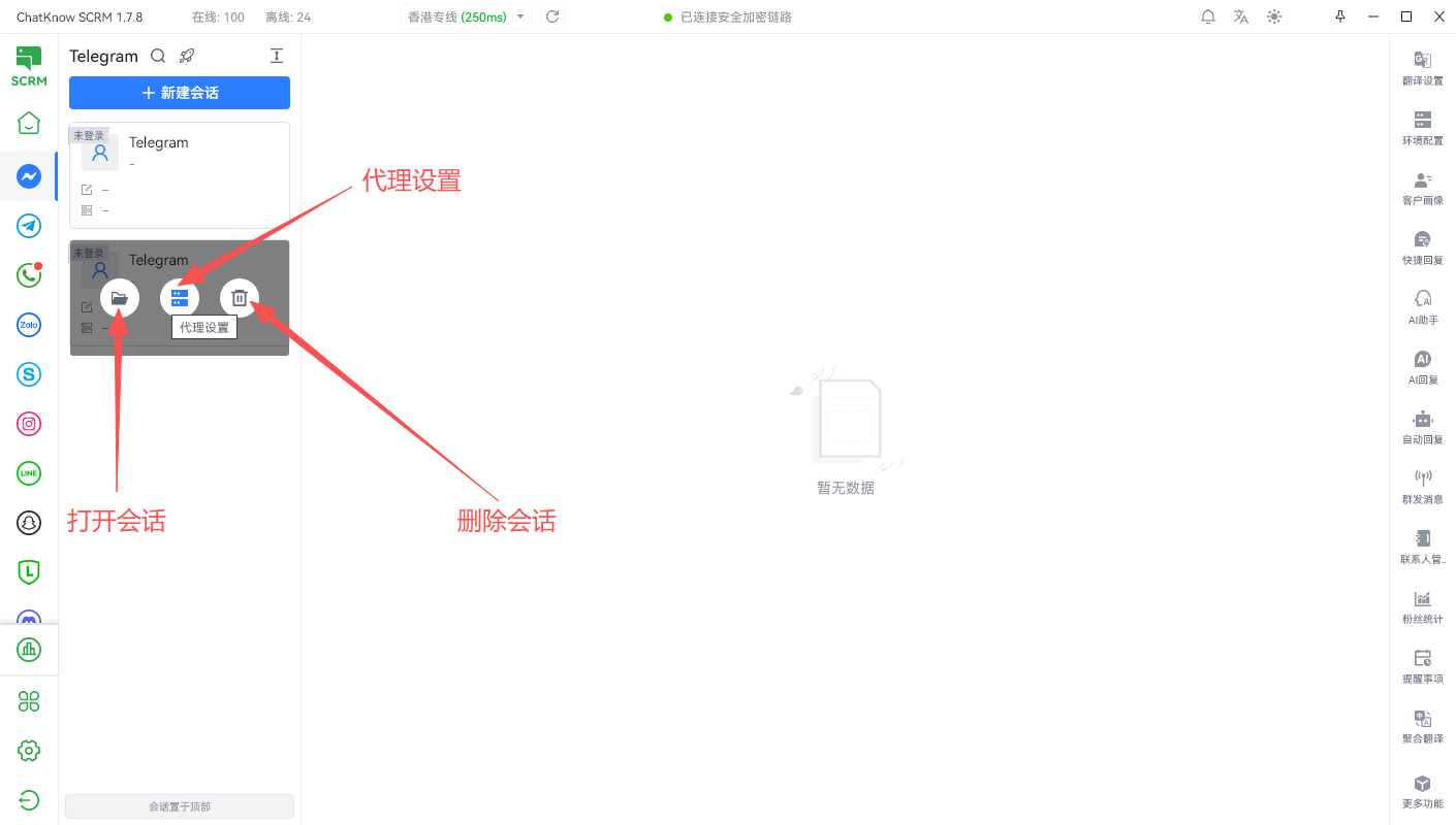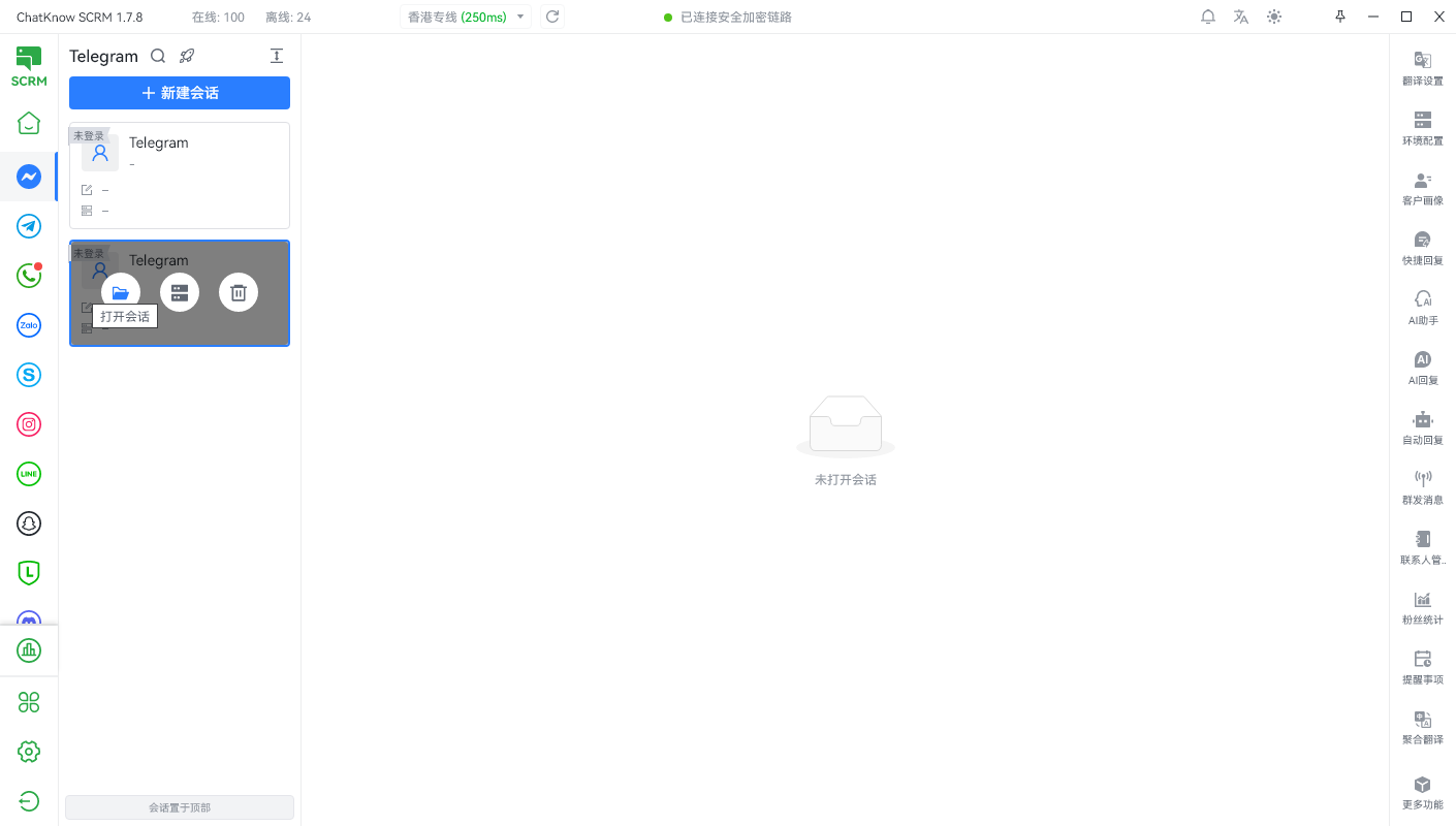 同时您登录过但关闭的会话，也可以通过此处的按钮进行“一键启动”便于您批量管理；您也可以点击“独立窗口”按钮来对某个特殊账号针对性管理