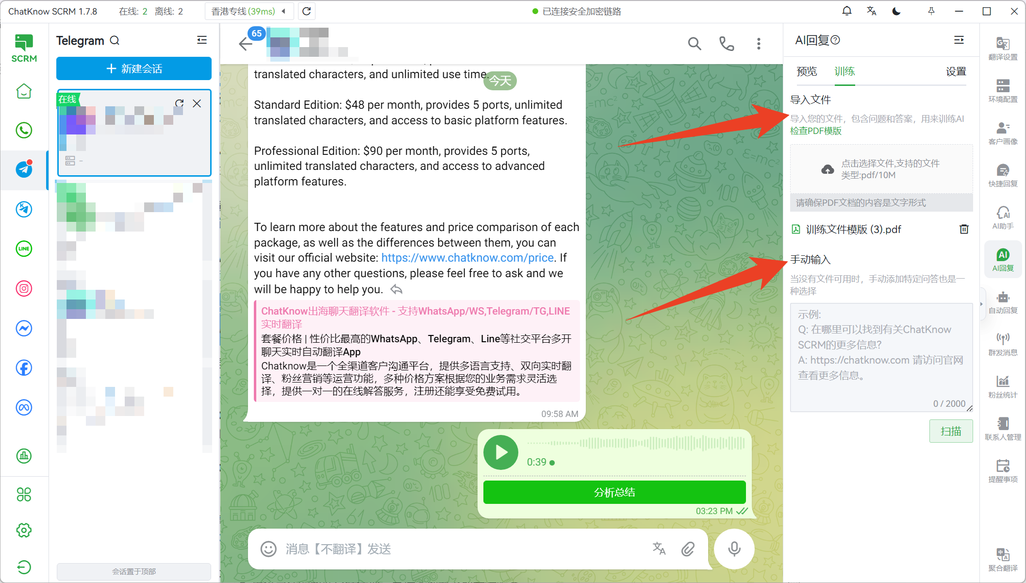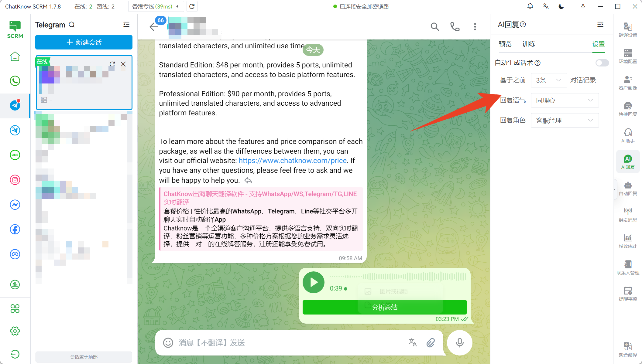 2、AI回复支持上下文记忆功能，结合聊天记录、回复语气、回复角色和训练的资料，智能生成回复话术。